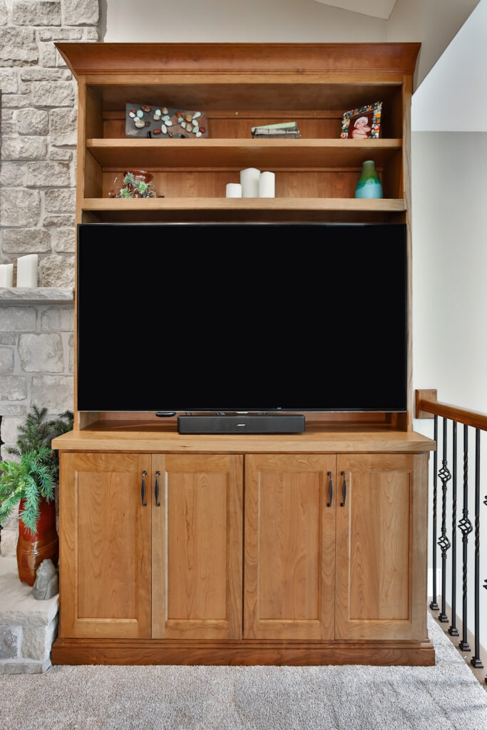 Custom Wood Products - Kitchen & Laundry: Paint Grade Maple in Soft White / Island: Alder in Cocoa / Bookcases: Cherry in Sage