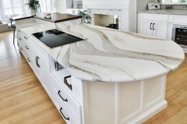 The waterfall edge—where the countertop material continues down the sides of the island—remains a strong trend. This sleek look creates a seamless, modern aesthetic that’s particularly striking with dramatic stone or quartz materials.